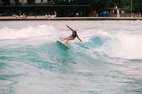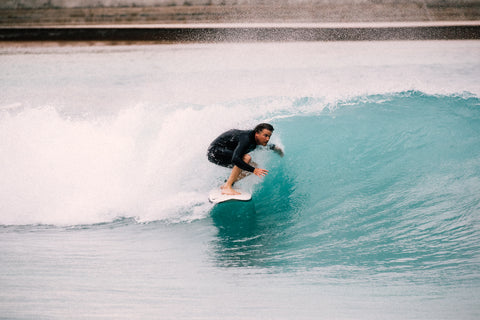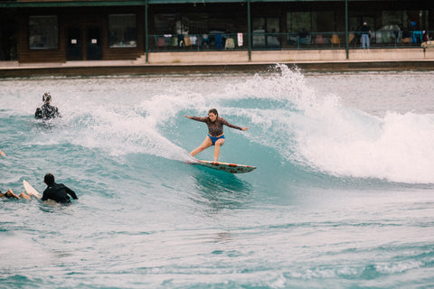 Personally, I wasted some money on the “Pro” session missing waves. The fact that it costs roughly between $18-$30 for each wave, whether you ride it or not, definitely makes it feel a little more high pressure than the ocean (but markedly cheaper than Kelly’s pool). The hardest thing to adjust to for me is not looking over your shoulder to gauge the wave. It appears essentially out of nowhere and the in-water guides instruct you to paddle towards different landmarks, like a light pole or a logo, which makes it harder to make subtle positioning adjustments you might make when paddling a farther distance. Once you’re up though, it’s easy to focus more on your surfing than what the wave is doing since the wave is mostly the same each time.